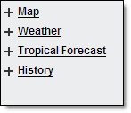 Various layers within five separate menus are available under the Local Radar Menu option. The layer menu includes Map Layers, Weather Layers, Rainfall Estimates, Tropical Forecast and Storm History. Selected layers are viewed in the content display.